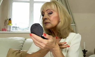 cougar de pelo claro con tetas enormes pone sus manos en una gran polla