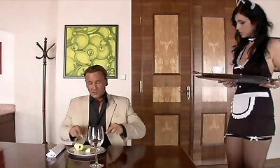 Sexy Lusty Brunette Maid Caught On Spying Gets Her Boss's Good-sized Jizz-shotgun In All Holes
