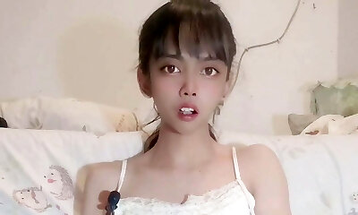 Adorable and petite Japanese tranny stroking her cock and jizzing